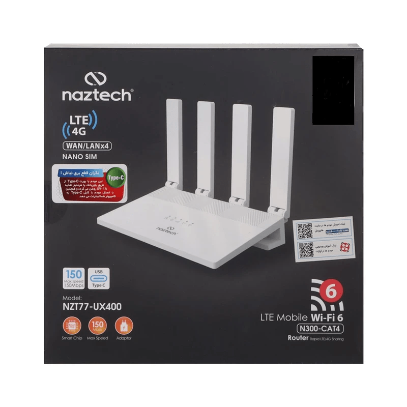 مودم نزتک 77UX400 یکی از پرسرعتترین مودمهای 4G بازار است که برای کاربران خانگی و اداری طراحی شده است. این مودم با فناوری Wi-Fi 6، قابلیت اتصال از طریق پورت تایپ C و تغذیه با پاوربانک، انتخابی ایدهآل برای تجربه اینترنتی پایدار و سریع محسوب میشود.1. پشتیبانی از Wi-Fi 6 برای اتصال سریعتر و پایدارتر مثل مدل پیشین 77DX Wi-Fi 6، محصول جدید NZT 77UX400 از استاندارد Wi-Fi 6 پشتیبانی میکند. این استاندارد، که با نام 802.11ax هم شناخته میشود، قابلیتهای بسیار بهتری نسبت به Wi-Fi 5 دارد و سرعت اینترنت را به طور چشمگیری افزایش میدهد. همچنین، Wi-Fi 6 عملکرد بهتری در شرایط شلوغ، مانند محیطهای با تعداد زیاد دستگاههای متصل، ارائه میدهد. 2. پورت USB تایپسی یکی از تفاوتهای اصلی مدل NZT 77UX400 با مدل پیشین خود، وجود پورت USB تایپسی است. این تغییر باعث میشود که اتصال به دستگاهها آسانتر و سریعتر شود. پورت تایپسی، به دلیل سرعت بالا و قابلیت استفاده در هر دو جهت (اندازه کوچکتر و طراحی معکوس)، به یکی از بهترین انتخابها برای اتصالهای مدرن تبدیل شده است. این مودم با پورت تایپ سی از طریق پاوربانک یا هر منبع تغذیه 5 ولت 1 امپر روشن می شود، و همچنین با اتصال مودم با کابل تایپ سی به کامپیوتر اینترنت می دهد. 3. سرعت انتقال داده بالا با استفاده از پورت USB تایپسی، NZT 77UX400 قادر به ارائه سرعت انتقال داده بالا است که برای کاربران حرفهای و علاقهمندان به گیمینگ و استریمینگ بسیار حائز اهمیت است. این محصول تجربهای بدون تاخیر و قطع اتصال را فراهم میکند. 4. طراحی زیبا و مدرن یکی از ویژگیهای مهم در طراحی NZT 77UX400، زیبایی و کارایی آن است. طراحی این محصول به گونهای است که نه تنها عملکرد بینظیری دارد، بلکه در ظاهر نیز بسیار جذاب و مطابق با استانداردهای روز دنیا است. 5. سازگاری با دستگاههای مختلف NZT 77UX400 با انواع دستگاهها، از جمله لپتاپها، گوشیهای هوشمند، و دستگاههای دیگر سازگار است. این ویژگی باعث میشود که کاربران بتوانند به راحتی از این محصول در محیطهای مختلف استفاده کنند. مشخصات فنی مودم نزتک 77UX400 – پورتهای LAN: ۴ پورت – تعداد آنتنها: ۴ آنتن قدرتمند – سرعت دانلود: تا ۱۵۰ مگابیت بر ثانیه – سرعت آپلود: تا ۵۰ مگابیت بر ثانیه – نوع شبکه: پشتیبانی از 4G و 3G – وایفای: فناوری Wi-Fi 6 با باند ۲.۴ گیگاهرتز – پورت Type-C: اتصال پیشرفته به اینترنت از طریق پورت تایپ C – منبع تغذیه: قابل استفاده با پاوربانک یا منابع تغذیه ۵ ولت و ۱ آمپر