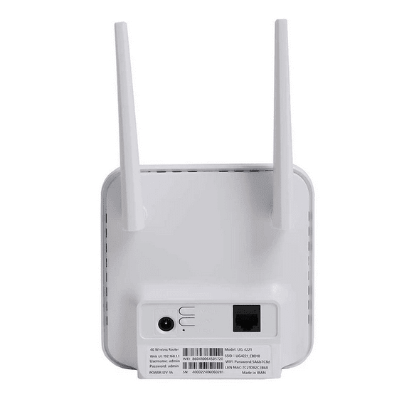 - سایر مشخصات: شبکه قابل پشتیبانی : ۴G LTE- ۱۵۰Mbps / پشتیبانی از سیم کارت / دارای دکمه ریست و WPS / دارای یک پورت LAN از نوع ۱۰/۱۰۰Mbps / دارای دو آنتن خارجی ۲/۴ گیگاهرتز با قدرت ۵dBi / ابعاد ۲۳×۱۲۵×۱۲۵ میلیمتر / پشتیبانی از شبکههای ۳G, ۴G و ۲G / ساخت ایران